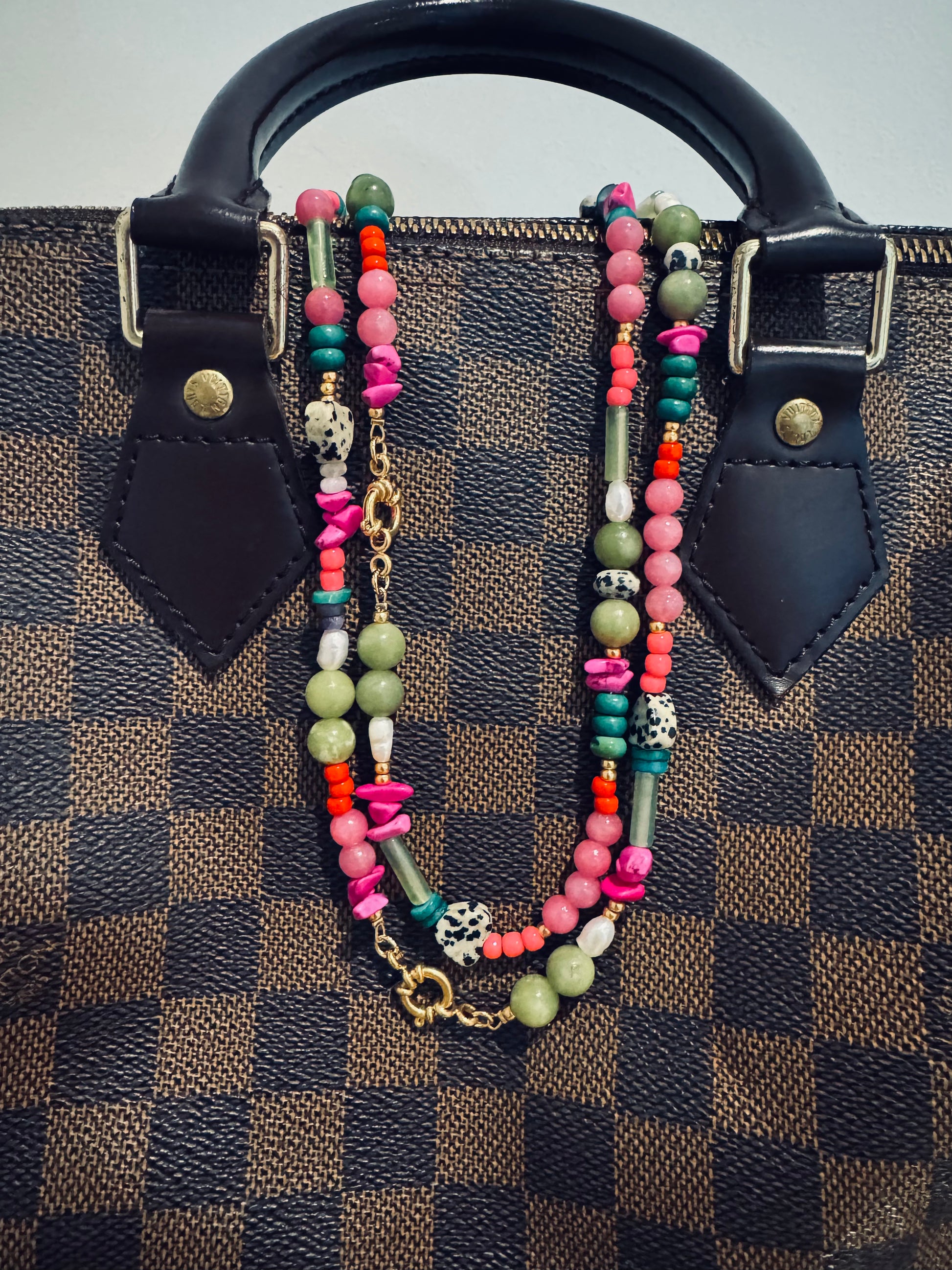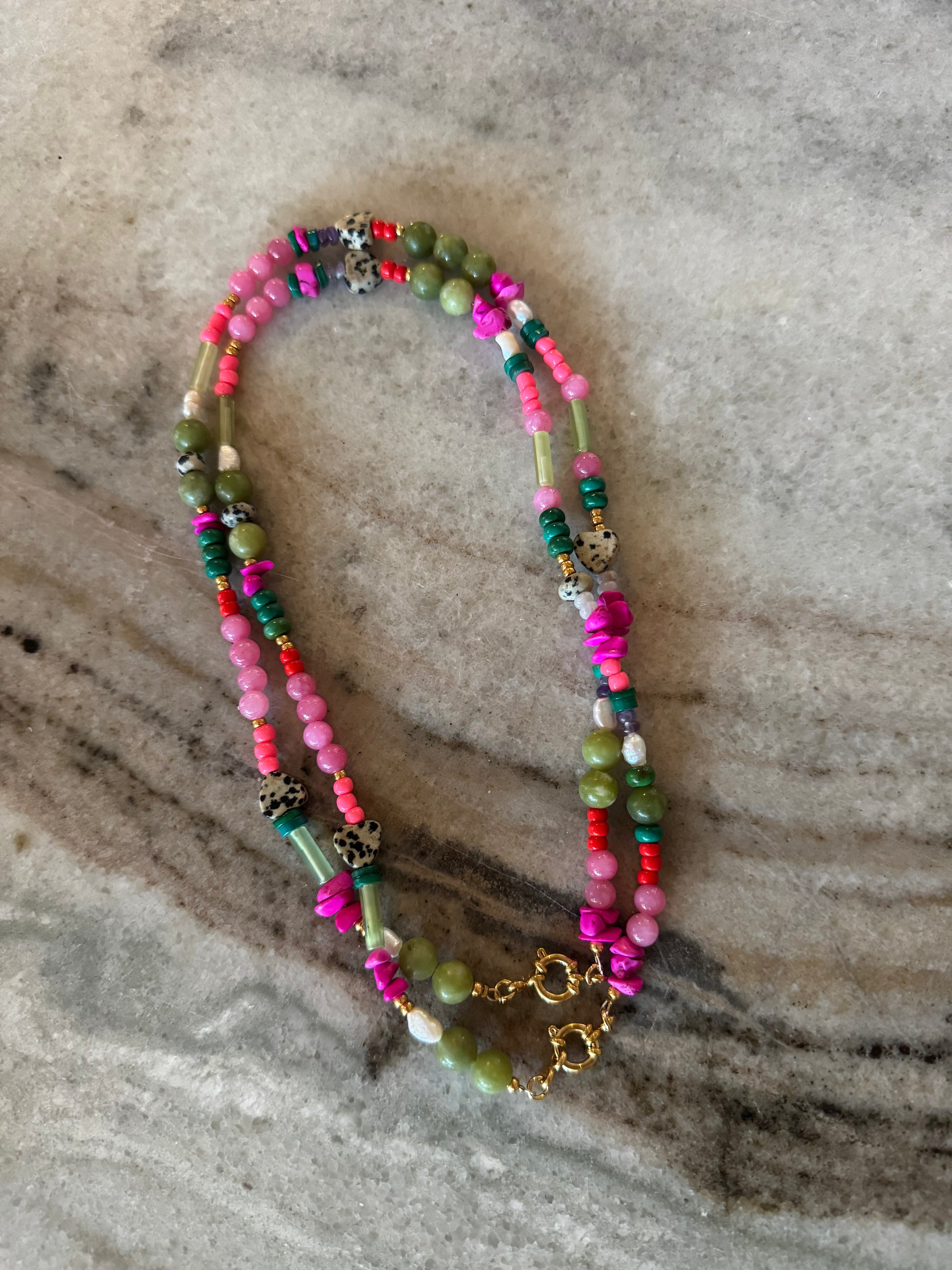 Prachtige ketting van verschillende natuurstenen, zoetwaterparels en schelp kralen.
