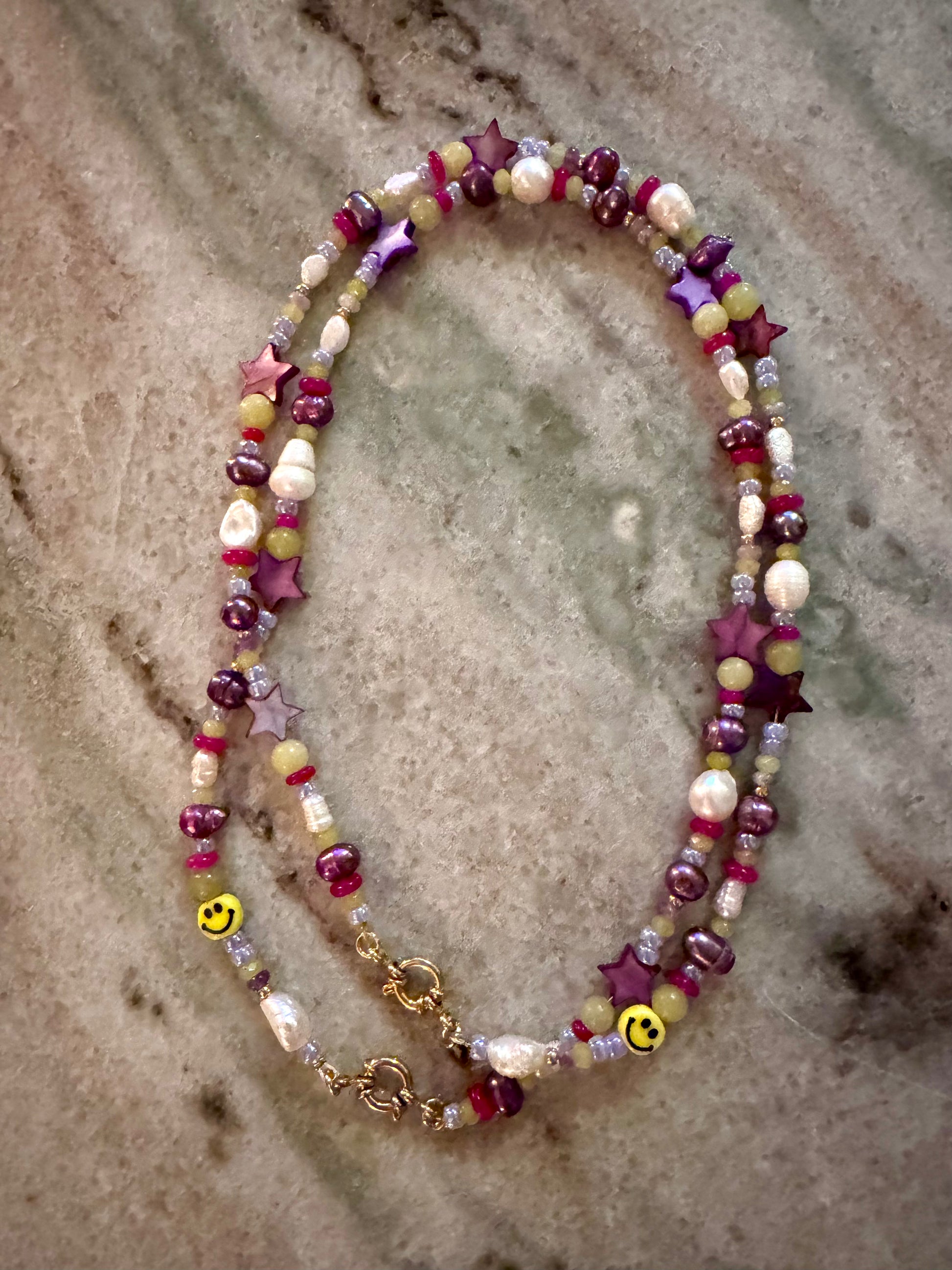 Prachtige ketting van verschillende natuurstenen, zoetwaterparels en schelp kralen.