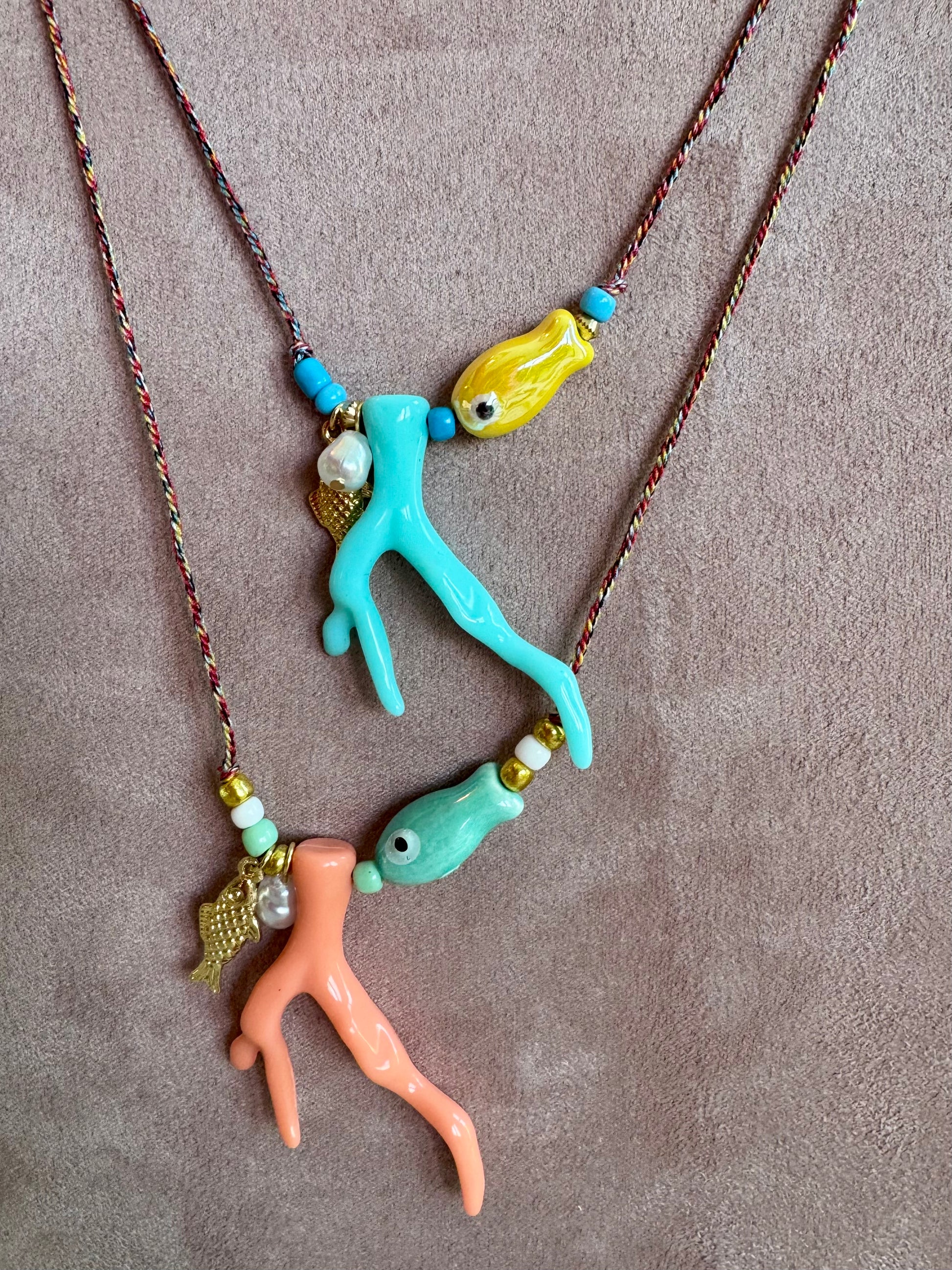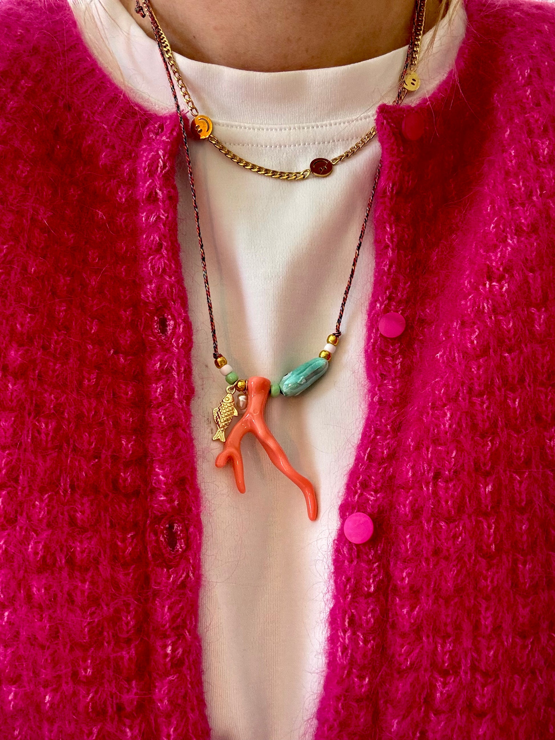 Koraal is plastic en visje goud stainless steel.